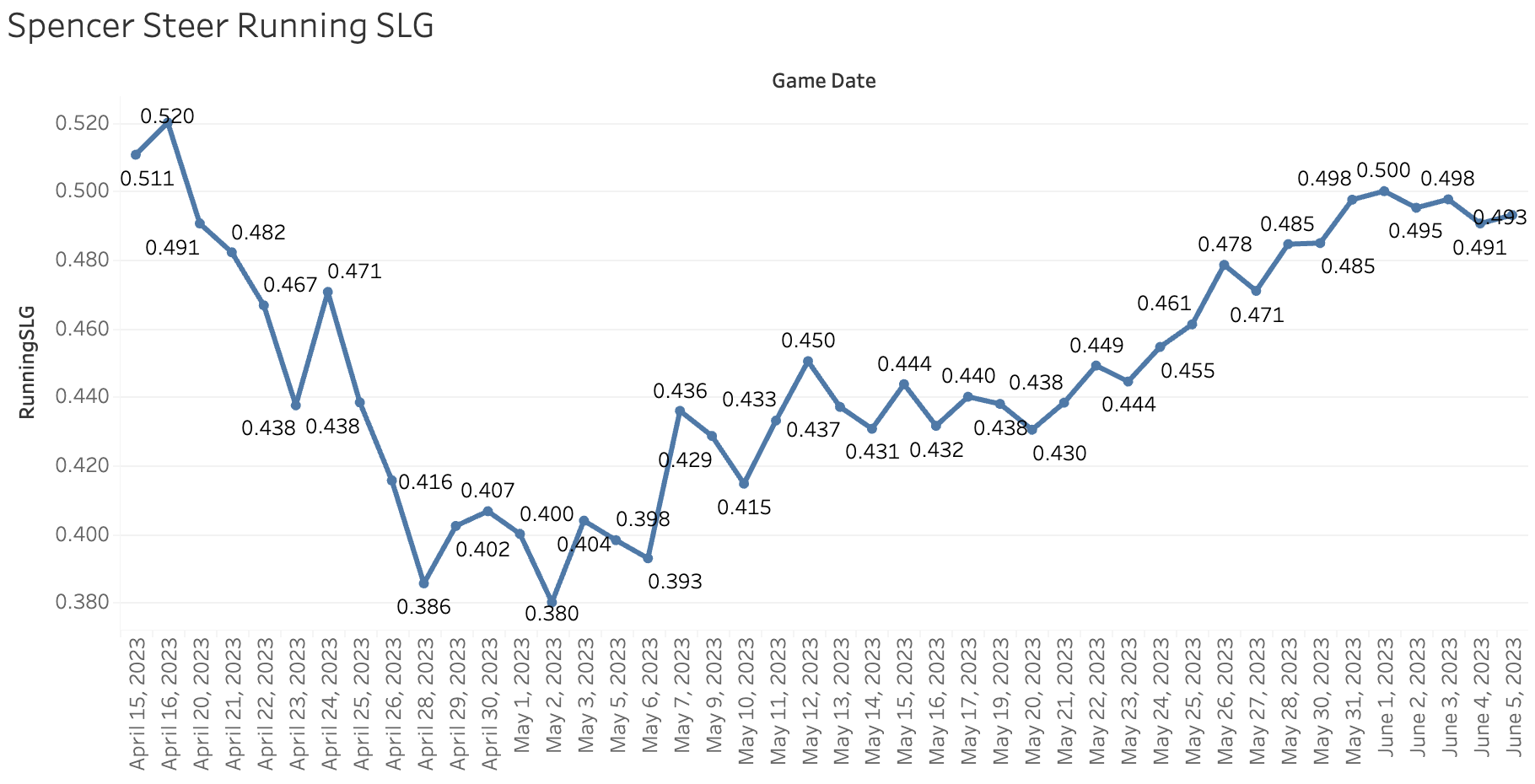 And then Spencer Steer is back performing well. He started very well, and then hit the pits, and now he’s climbing back up the charts: