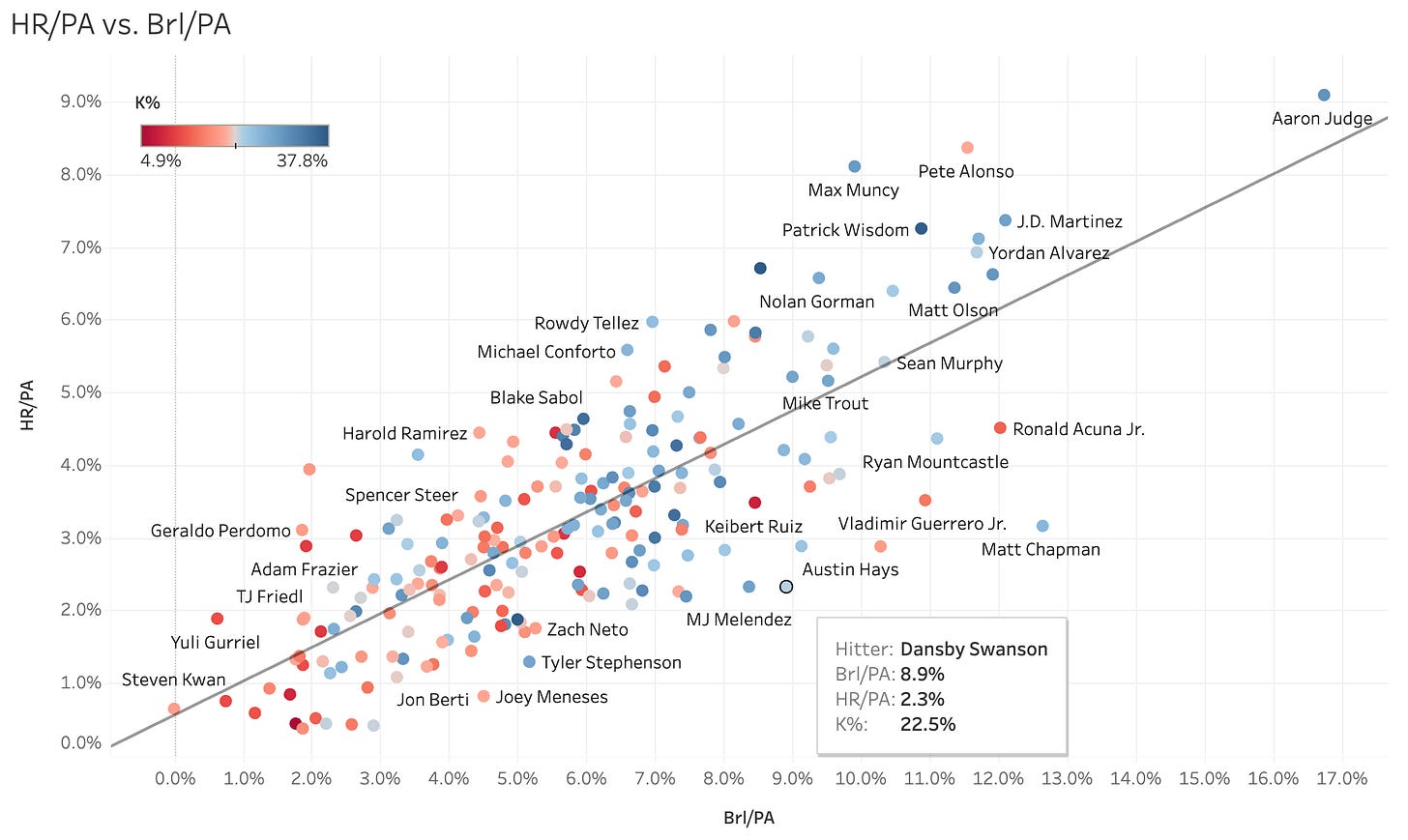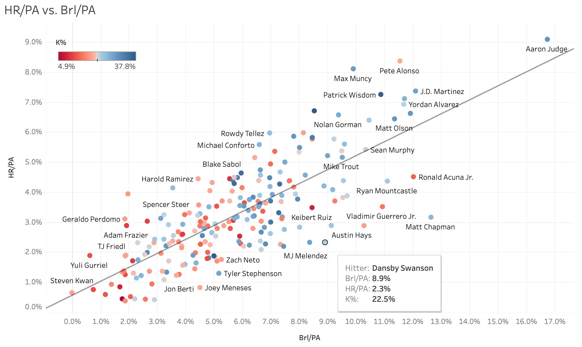 He’s a standout on the HR Rate vs. Brl Rate scatter plot: