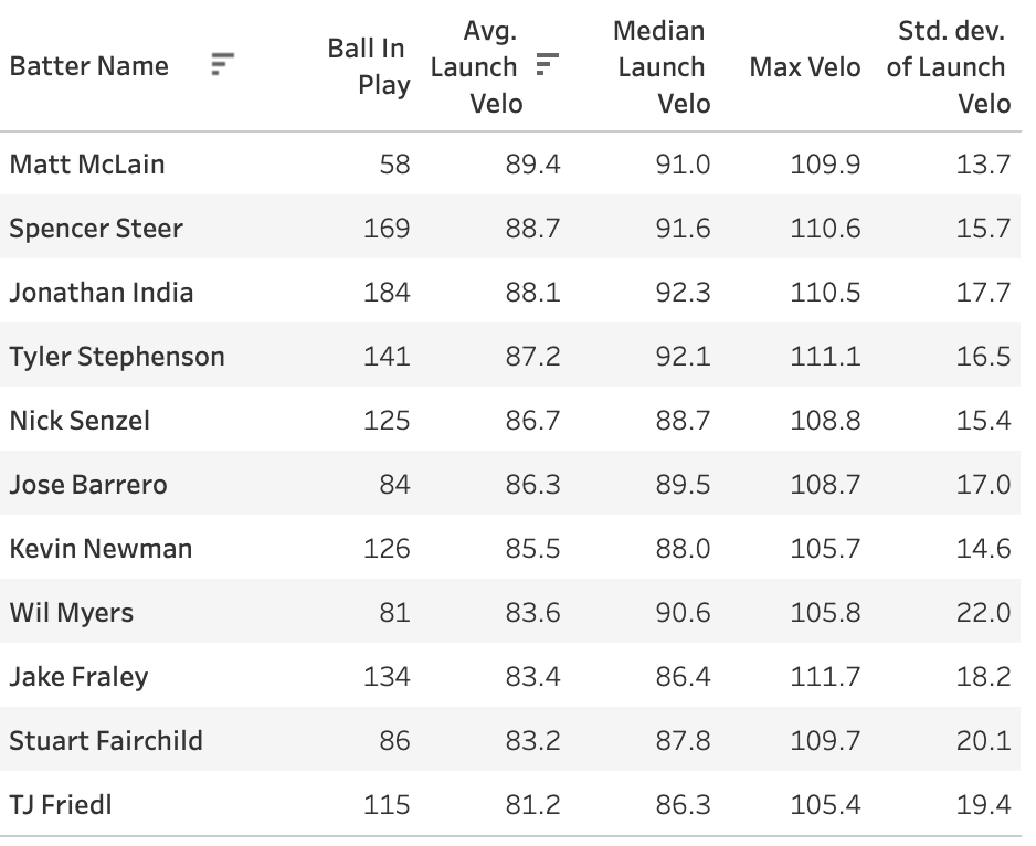 He’s got his K% under 20% for the year, and it’s a very good thing to put balls in play in Great American Ballpark. He trails only McLain on the team in term of average exit velocity:
