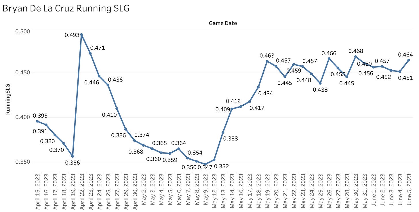 Bryan De La Cruz has just had a rollercoaster of a season. He’s gone from the hot hitter tracker to the cold hitter tracker and back a few times, but he’s on the upswing right now.