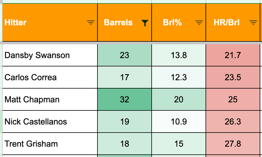I’d like to highlight that Dansby Swanson has had some rough luck with his barrels. Maybe it’s not luck and it’s his profile and ballpark, but of all the hitters with at least 15 barrels, he has the worst HR/Brl rate: