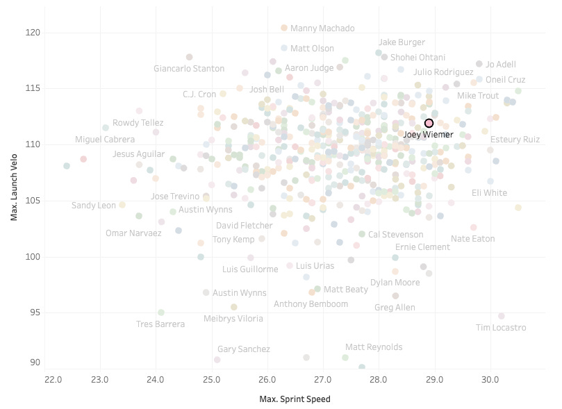 Joey Wiemer is a pretty interesting name to look at. He is your classic sell out for power hitter with a 28.4% K% and a 66.6% Contact% but a high 10.4% Brl%. Since May 15th he has a 16.7% Brl% and a 34.5% K%, so really pushing it there. He hits the ball in the air a ton (33% vs. a league average of 26%). This makes him a low batting average player, for sure, but he has really good foot speed, which helps:
