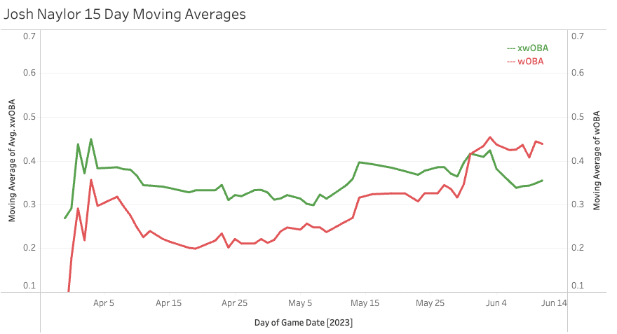 Josh Naylor - 68 PA, 0.455 wOBA, 0.381 xwOBA, -0.074 Diff