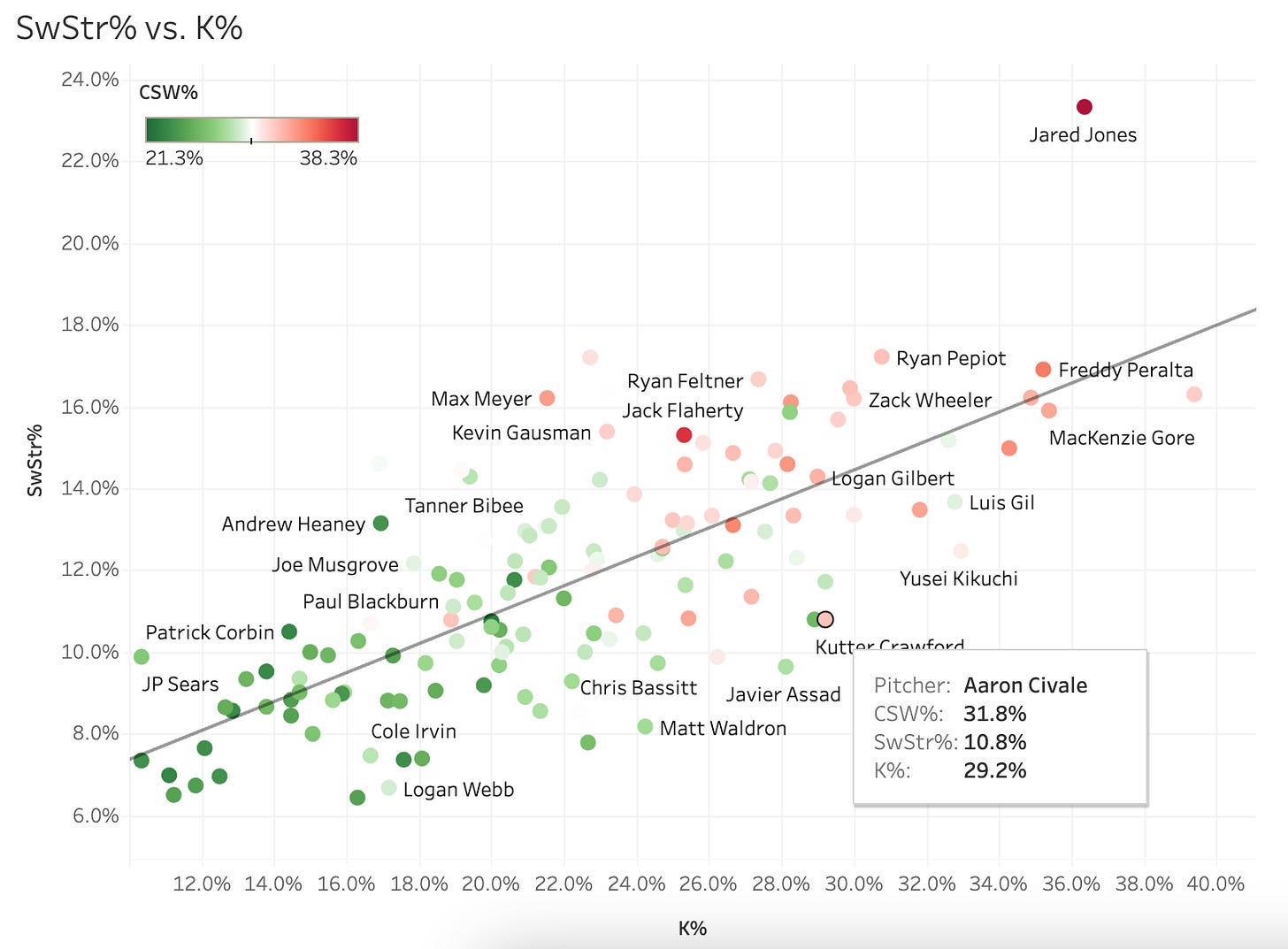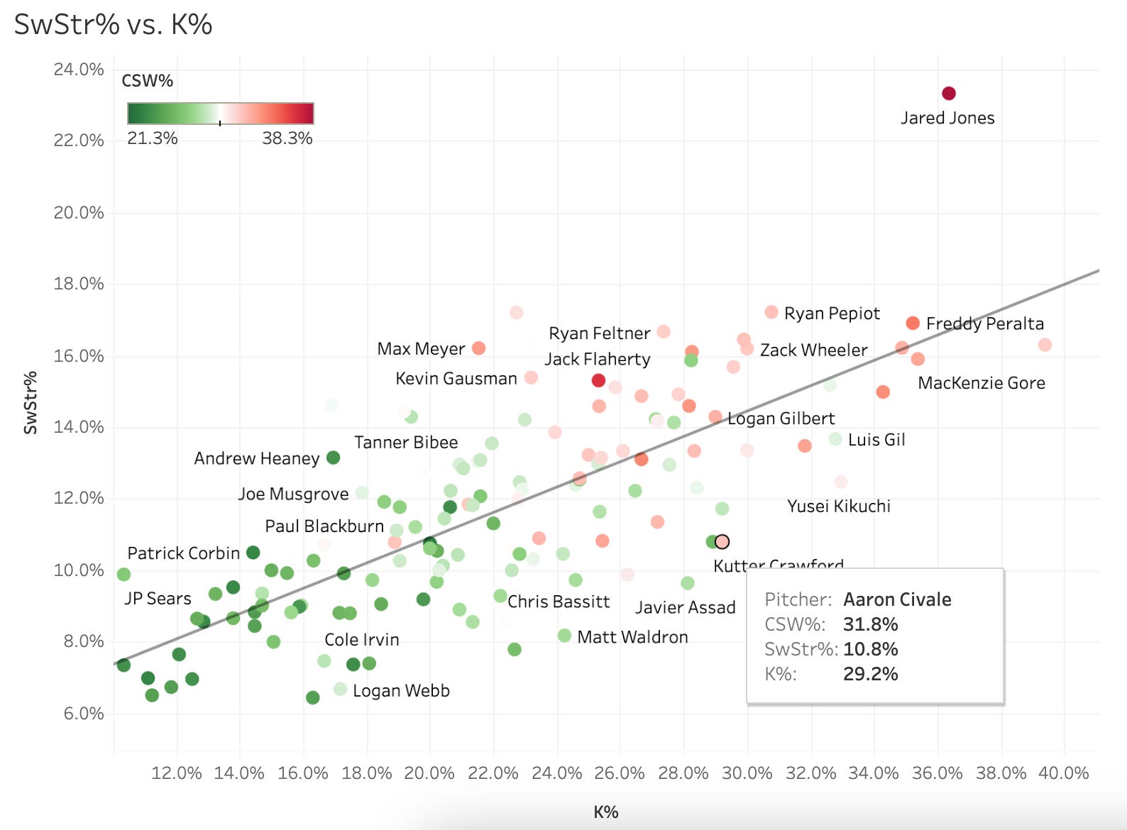 It’s pretty weird to see Aaron Civale here, especially after you see his 10.8% SwStr% and 47% Strike%. Both of those numbers would imply a K% below 23%, so I have serious doubts on him maintaining a good K%.