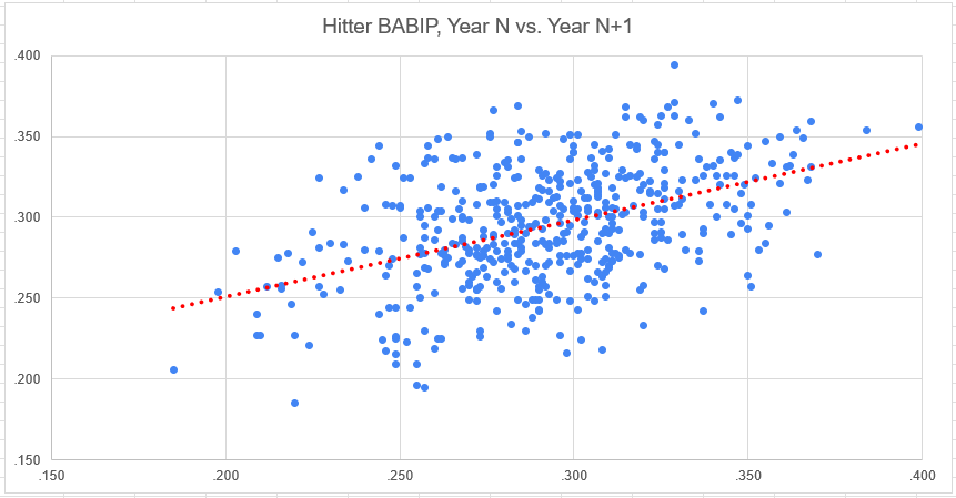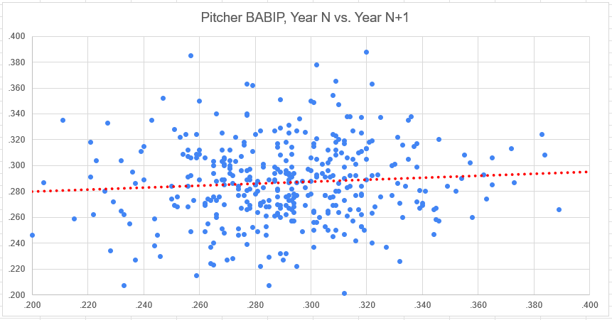 The correlation for hitters is 0.44, and for pitchers it’s down at .08. That means that pitcher BABIP should be expected to regress back toward the league average. This makes it a lot easier for us to find regressors. So let’s look at them.