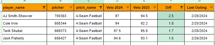 We probably shouldn’t get hung up on this stuff at all since we’re talking mostly about one-inning of work as pitchers are just getting going, but some early velo bumps to keep an eye on (I would say that if the velo stays that high all spring, we should expect it to stay high as we go into the regular season):