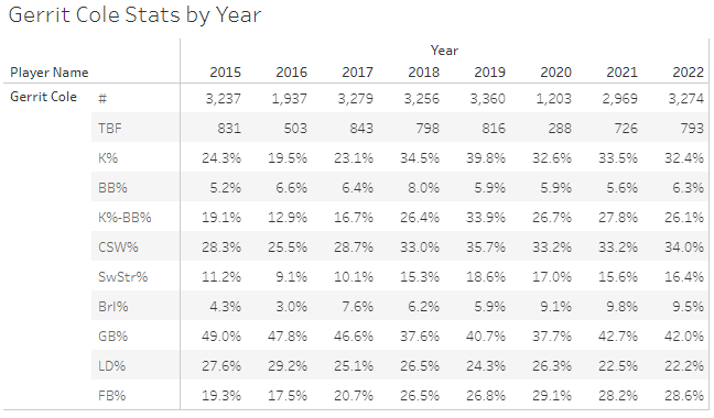 I don’t think we really need to talk about Gerrit Cole. As you see above, everything stayed right on pace with his recent career, he’s elite. The K-BB% at 26% is great, and the SwStr% and CSW% stayed amazing. The barrel rate is up there, but that’s nothing new. The guy will give up some homers, but he’s a bonafide ace and he’s been an iron man to boot. Only Aaron Nola has faced more batters than Cole since 2018, and nobody has thrown more pitches. Cole is a top three SP for me.