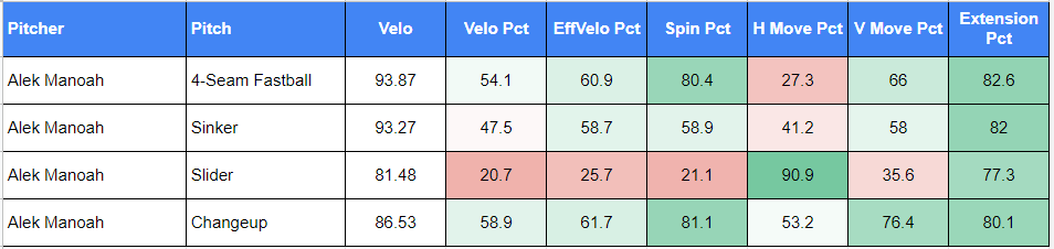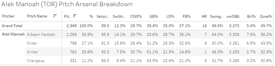 This isn’t necessarily bad news. He still had a good year despite this, and it does open up the possibility for a big jump forward if he can improve against lefties. The way to do that would be with the changeup, which he has - but it’s not all very good with the 9.4% SwStr% and 21.1% CSW%. I wouldn’t be surprised if Manoah is making that pitch his main priority this offseason, and any improvement there would make a big difference for him.
