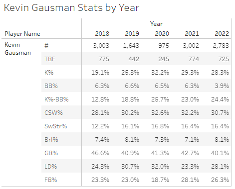 We have seen really good SwStr% rates from Gausman since way back in 2019, and then in 2020 we saw the K% kick up and it has stayed there while he’s maintained a low walk rate.