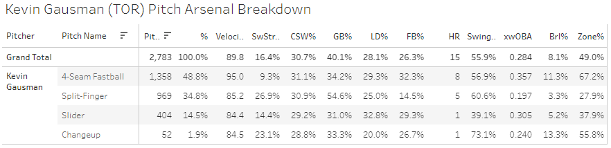 So it wasn’t a big fall-off. The K-BB stuff and the SwStr% stayed great, in fact, the K-BB got better with a superb 3.9% BB%. It’s all good for Gausman even at the age of 31 here now.