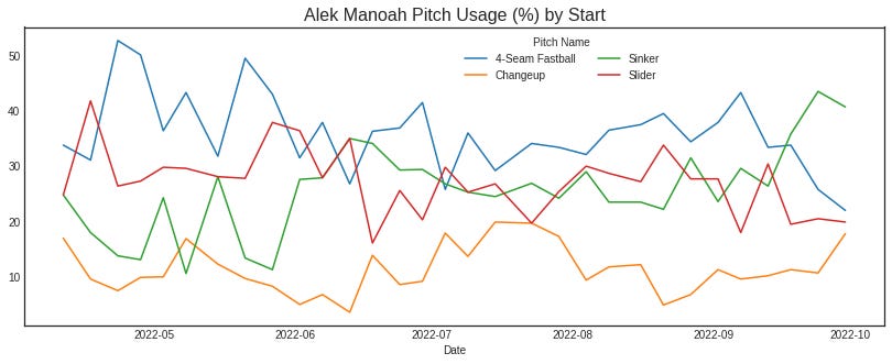 Manoah faced a left-handed batter 56% of the time. Right-handed pitchers as a whole in the league faced a left-handed batter just 45% of the time - so lineups were clearly being loaded with lefties against him on purpose.