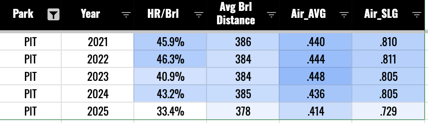 The humidor effect has to do with the flight of the baseball. So I think it’s useful to check my park factors data and see what happened to batted balls hit in the air in Pittsburgh. Here’s that data: