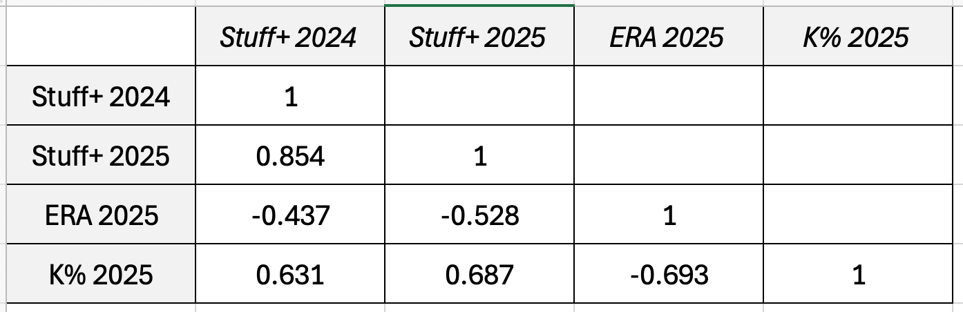Stuff+ does predict future K% moderately well. Here’s a correlation coefficients table of 2024 Stuff+, 2025 Stuff+, 2025 K%, and 2025 ERA: