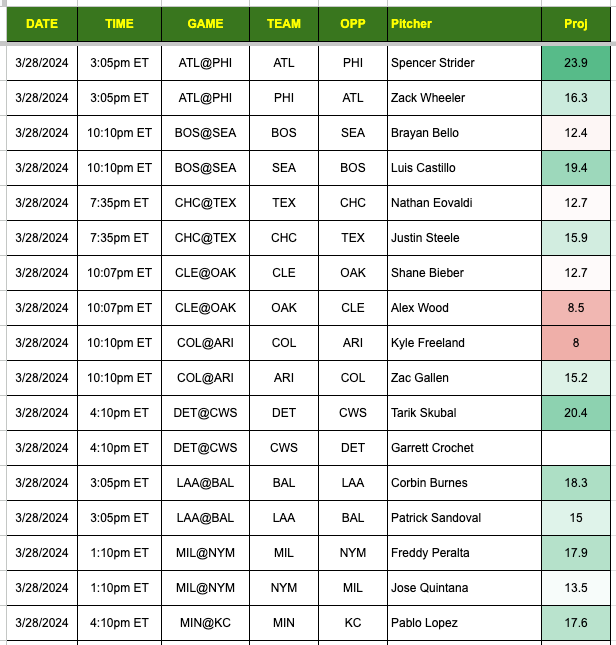 One of the most used resources I have here is the Probable Pitchers - Next 10 Days Google Sheet that updates daily. It lists the probable starters for every game across the next 10 days, and gives you a projected projection (that’s right, a projected projection!) for each start. Here’s what it looks like: