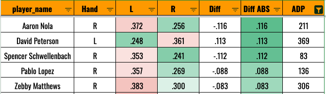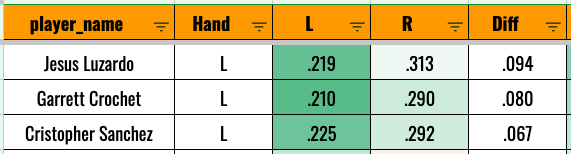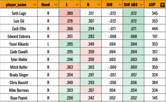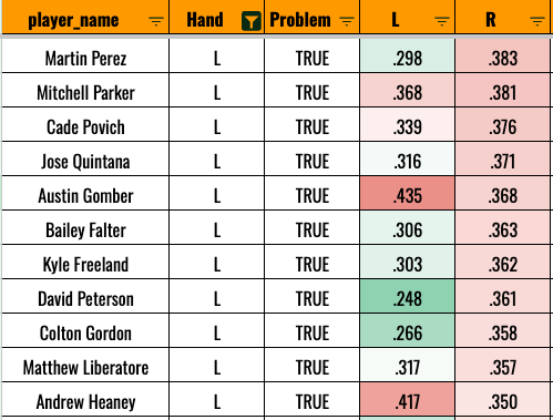 Only Povich, Peterson, and Liberatore are being drafted in the top 500 this year. So this is more of a general tip. If you’re going to invest in a left-handed starter, make sure they can get righties out, because they’re likely to face a lot of them (and increasingly so if they start struggling against righties).