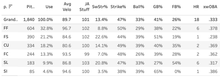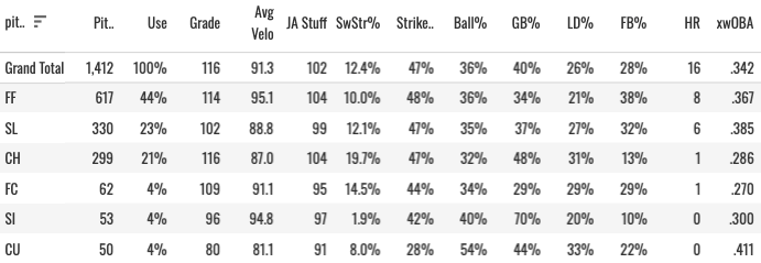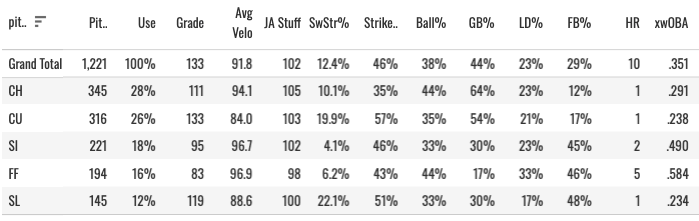 Pepiot has a good changeup, and that helped him handle lefties pretty well (he gave up home runs against them, but that should be helped majorly by the park change this year). Against righties:
