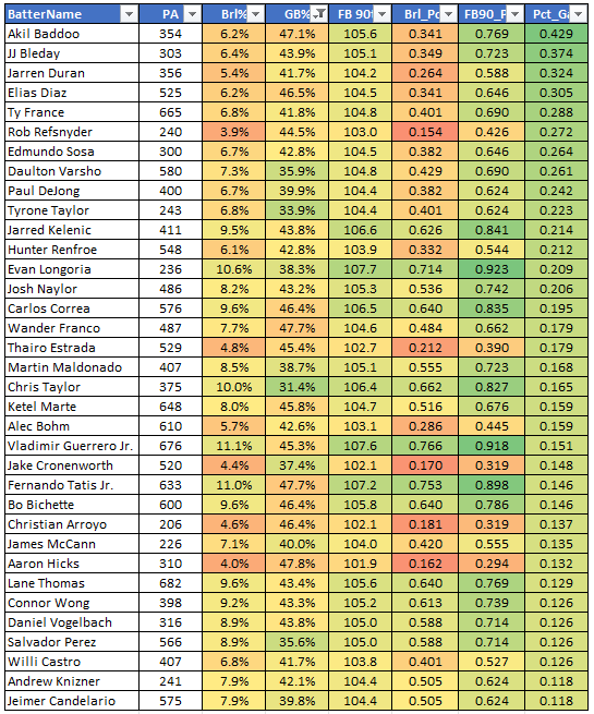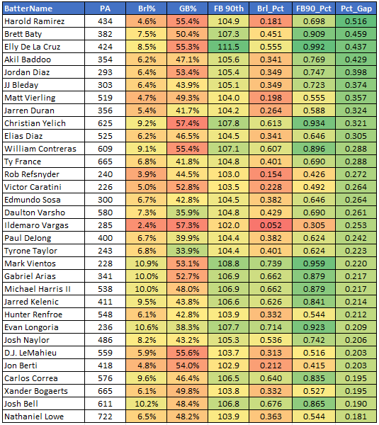 Mostly here we find hitters with very high ground balls rates. That makes sense since a high Brl% requires a higher FB%, but EV on fly balls is completely blind to ground balls, since it filters them all out from the jump.