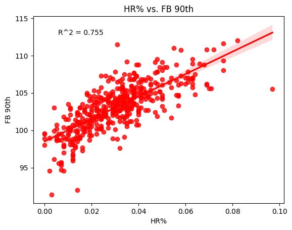 FB 90th here does decent at predicting HR% to take out that middle man, but it’s better at predicting barrel rates (HR% is a little bit random because certain parks factor into it).
