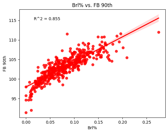 To go down one more level, and to get to the point, we can use 90th Percentile Fly Ball Exit Velocity to predict Brl% pretty well.