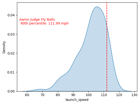 98 is the 90th percentile mark. Here’s Aaron Judge’s fly ball EV distribution from 2023 with that 90th percentile mark shown: