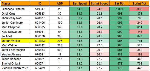 I am betting on skills and youth here. Walker is among the elite in bat speed, and he adds an 82nd-percentile sprint speed to go with it.