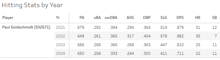 He did strike out more last year (23.5% in 2023, 26.6% last year), but he was still hitting the ball hard (92nd percentile hard-hit rate, 73rd percentile barrel rate). You can backslide and still be nowhere near the bottom of the hill, and I think that’s where we’re at with Goldy.