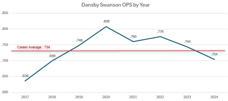 “Draft Dansby Swanson” is not going to be a bullet point on my draft guide, but I do think a bounce-back year can happen. There was not an injury to blame, and the guy is still decently young (he’ll turn 31 this month). This is simply a pick based on the principle of regression to the mean.
