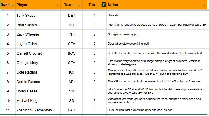 For the free subscribers, here’s a little sample to entice you: my first three tiers of starting pitchers.
