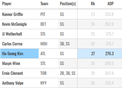 He is currently going around shortstop 27 in NFBC drafts. An interesting edge is the unproven risks going in front of Kim. There is no guarantee that Griffin, McGonigle, or Wetherholt will break camp with the big league team. MLB service time manipulation is going to factor into these guys getting called up. Drafting one of these players could be detrimental to your team if they are not called up until June. Ha-Seong Kim at ADP 270ish is an excellent value for the production he can provide - as long as he is healthy.