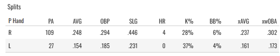 The IKF signing now fills into a bench role, maybe getting 2 or 3 starts a week. I would bank on Mayer and IKF platooning at third base. In standard roto leagues, that would be a pleasant sight for Mayer owners. In his cup of tea at the majors last year, these were Mayer’s splits.