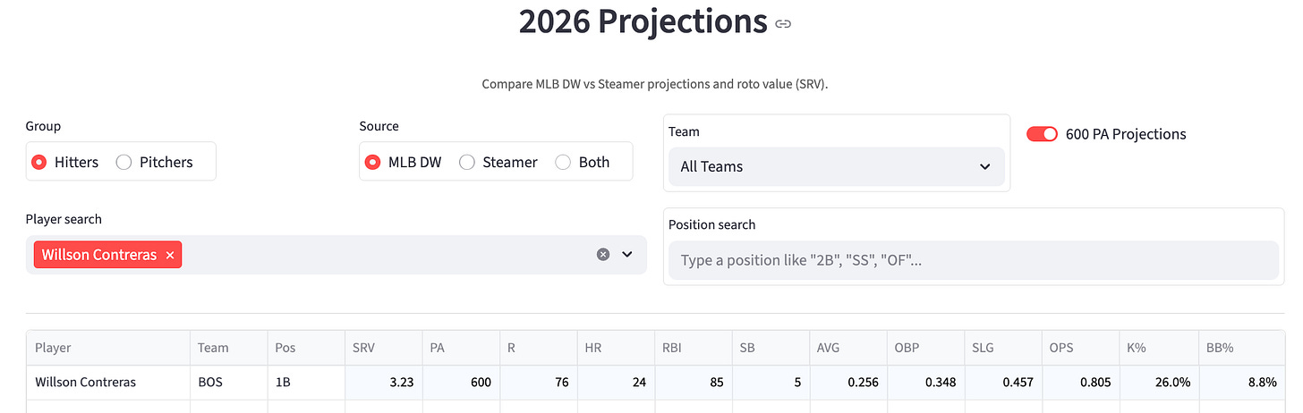 It’s not a World Series lineup, that’s for sure, but the top five are solid enough to boost Contreras to a nice counting stat season if he stays healthy and maintains that elite power. He put out 95th-percentile bat speed with an 85th percentile xSLG last year. My new projection or 2026: