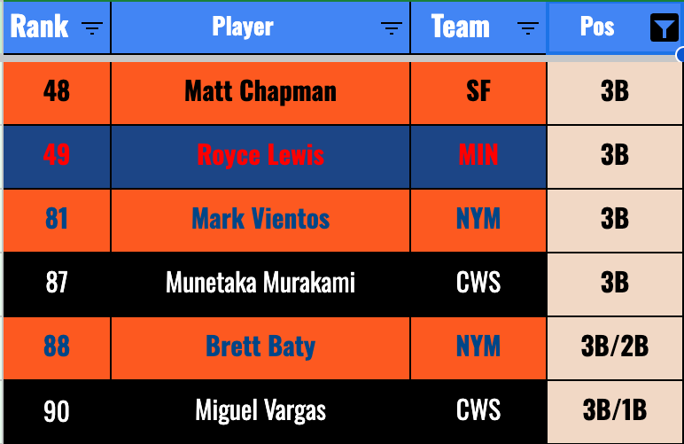As for my ranking, I CAN’T TELL YOU YET. That’s because I’m going through team-by-team one player at a time to make my rankings. I’m a little bit more than halfway through, but I’ve put the guy between Mark Vientos and Brett Baty for now.