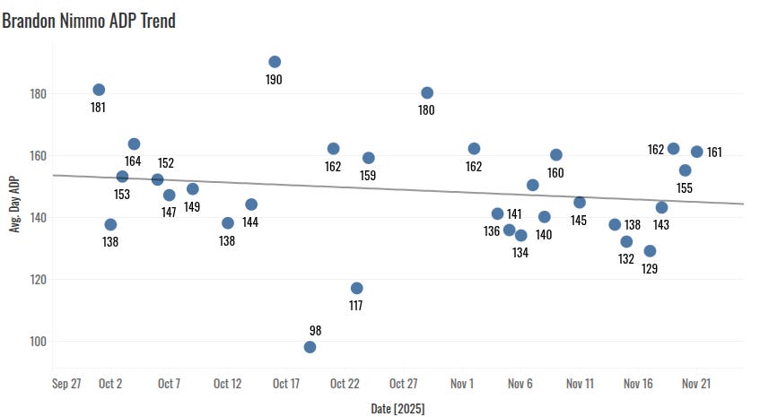 Texas has struggled offensively ever since its Cinderella 2023 World Series title. Nimmo provides a highly durable bat in the lineup. The Rangers will expect Nimmo to provide a spark by getting on base ahead of Langford and Seager. In recent drafts, we can see on the ADP Draftboard that Nimmo has been going slightly earlier in drafts since the beginning of October. We will see if this trend continues after the news of his new home breaks. Nimmo is under contract through the 2030 season, making $20.5 million AAV.