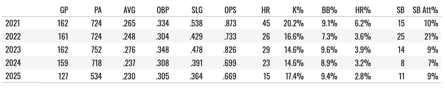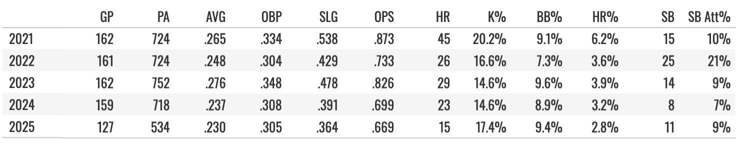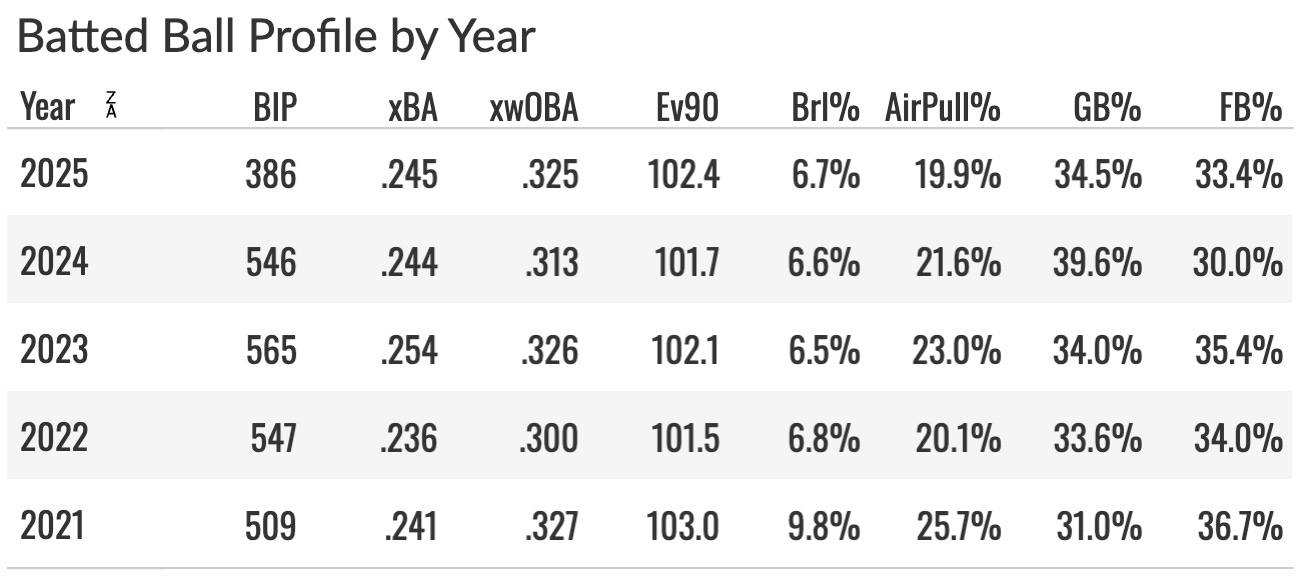 Since that 2022 season, the steals really haven’t been part of his game, and that’s why the league has massively jumped in that regard. And the power has dried up. He dropped six homers from 2023 to 2024, and then eight more from 2024 to 2025. Just a 15-homer and 11-steal season last year while hitting .230 and not staying healthy all year for the first time. That’s a bad fantasy player. My guess is that the skills are gone. The only way he was ever able to hit 20+ homers was with a high Air Pull rate. He was Isaac Paredes before Isaac Paredes showed up. We’ve seen his air pull rate drop in a very similar fashion to his home run rate.
