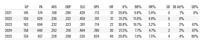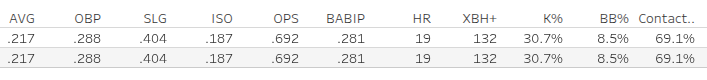 619 PA, .228/.296/.444, 30 HR, 76 R, 83 RBI, 29.3 K%