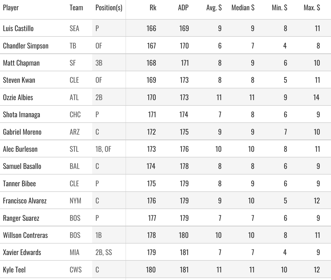 I like this round. So I don’t have much conviction here. Similar to Simpson, Kwan can be very valuable in fantasy as long as the team context makes sense. He’ll probably top out around a dozen homers and 20-25 steals, but he offers the possibility of a .300 batting average in these days of that being very, very rare. So if you enter the draft knowing you’ll take him, and then you take on a couple of high-power, low-average dudes to match with him, that’s perfectly fine.