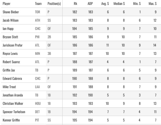 This has been a fun series. I’ve been slugging a lot of these outs in fits of writing. The ADP has been shifting slightly as I’ve gone through it, so you might see some repeat names in the screenshots.