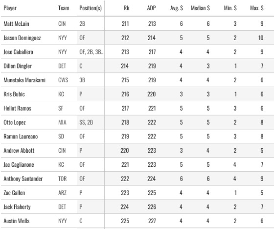I made a case for Chandler Simpson, and I think what’s happening is that people find themselves in desperate need of steals after pick 200, and they look up to see someone else taking Simpson. So they panic and take Caballero, the league-leader in steals last year.