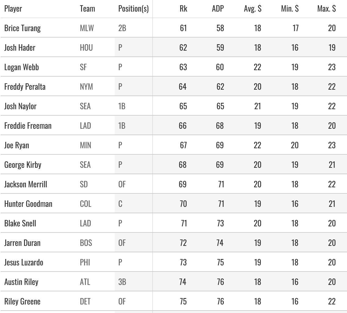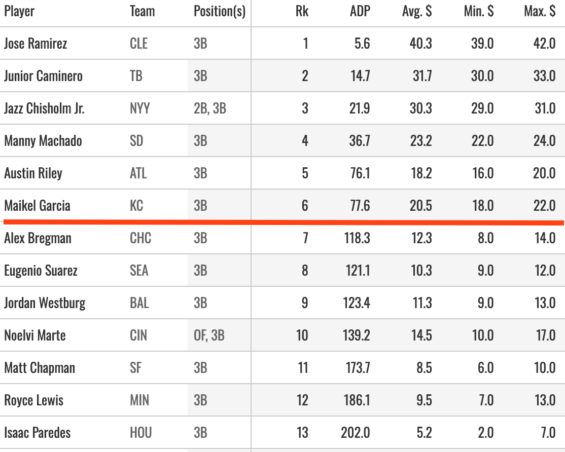 His placement in the position is another reason I think he’s super sharp this year. I love getting in before “the cliffs”, meaning to get your starter at each position before the first large drop-off in value. Riley and Maikel Garcia are right there on the ledge at third base.