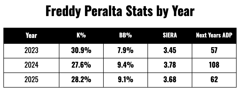 Same indicators as always, and yet you’re having to pick him 40 picks sooner this year. He benefited from a career-low .243 BABIP and a career-high 85.5% LOB% last year, and that’s what turned the 3.68 SIERA into a 2.70 ERA. I’m surprised the NFBC bro’s are falling for it in the way they are. I think he’ll be fine, and he could win a ton of games with the Mets, but the price is wrong. Don’t be a fish.