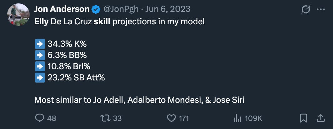 The upside is absurd. The raw talent has always been there. And I was an Elly critic in his rookie here! I famously (in my own mind, nobody else remembers it… but I think about it 23 hours per day and tell my wife and kids about it every night before dinner) gave my model’s skill projection for the dude when he got called up, and I was dunked on by Reds fans for days after that (which equates to 23.79 years in social media time, mind you).