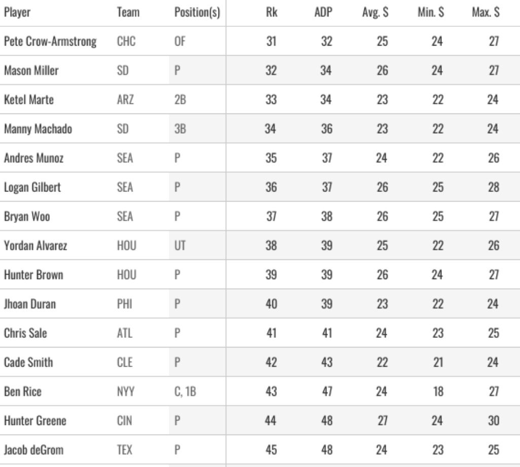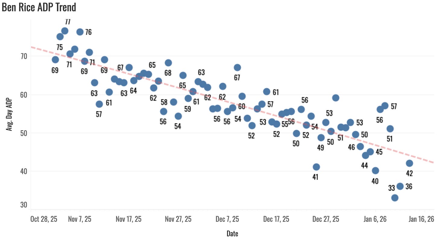 I have to comment on this Ben Rice thing. You rarely see anything like it. The kid is around a 40 ADP now after starting at 75, and nothing has changed. He was always a sharp pick, but it’s just been like a reverse game of chicken this draft season to see who can get him first. Everybody wants him, everybody knows other people want him, so he keeps getting picked earlier and earlier. It’s wild to see.