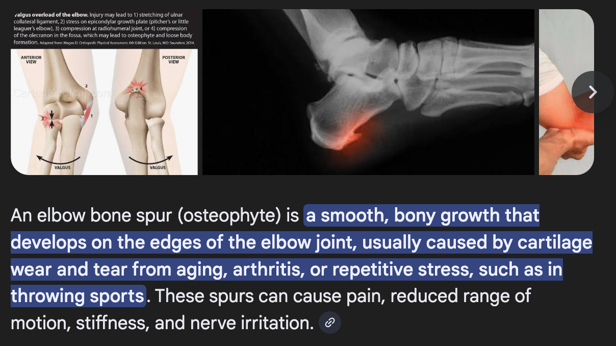 There’s been a lot of talk about high velo and velo increases being correlated to injury risk. And this is a win for those in that crowd. Schwellenbach kicked up the velocity by a tick from 2024 to 2025. He took it from 96.1 to 97.1. And what did he got for his hard work? A broken ass elbow. And when his broken ass elbow grew back, it grew back with an extra weird spur part.