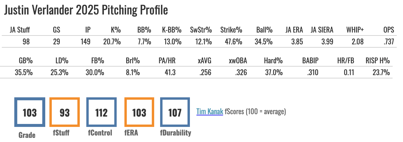 For fantasy leagues, don’t bother. I’ll be targeting him with hitter stacks in DFS early and often in 2026. That 30% FB% played okay in cavernous AT&T Park, but with some of the changes they made to Comerica Park recently, this is about a league-average park for hitters. So I think Verlander is going to give up plenty of bombs this year before his retirement party.