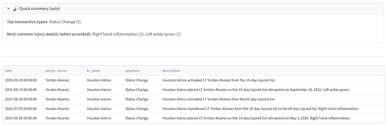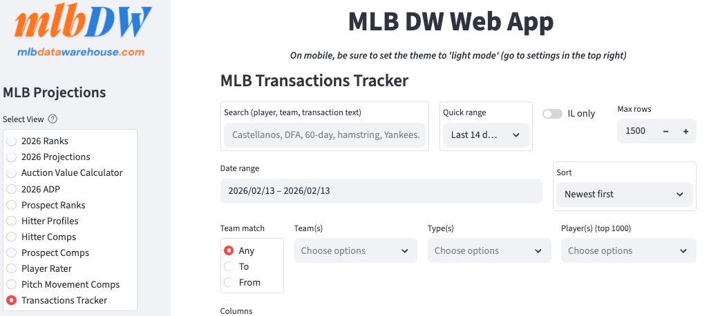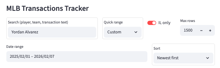 The most obvious way this becomes useful is tracking a player’s IL movements. To do that, type in a player name and a date range, and select that IL ONLY slider: