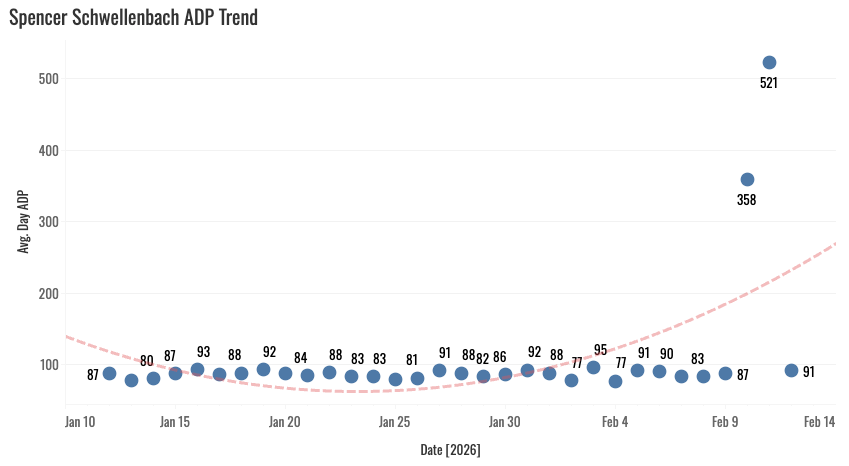 Same story as Schwellenbach. He went at ADP 662 last time. We’re thinking he might be out for the year as well. Unlike Schwellenbach, he’s not definitely good, either. So an August return might not be worth much at all. Just forget about those two guys.