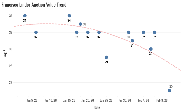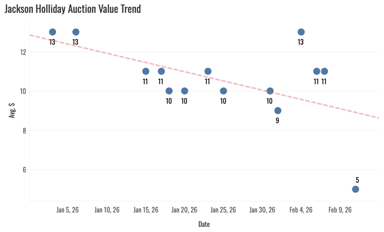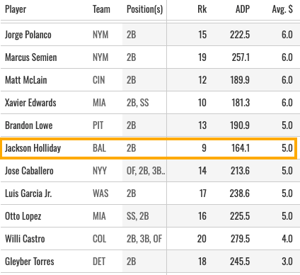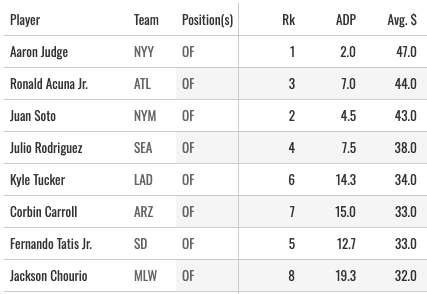 In auctions, he was going for $39-$41, and he went for $33 in the most recent auction. That takes him out of tier one and moves him to tier two, below Julio Rodriguez and around the names like Fernando Tatis and Jackson Chourio.