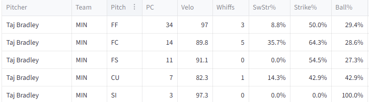 As we can see, the fastball generated some whiffs, but if he were to rely more on his cutter, he could miss a few more barrels, according to the data. Taj is trying to make his case to occupy a spot in this Twins rotation.