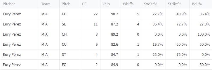 The 22-year-old has big expectations for this upcoming season. On Sunday, Eury tossed 4 innings of no-run ball, issuing 1 walk and 5 K’s. His arsenal is filthy. Look out for a huge season from Eury. The K’s have never been an issue, just the walks. The only concerning thing I see from this chart is the 100% Ball% on his changeup in 8 pitches. Maybe he’s trying a different grip or something, but it’s not something worth worrying about now.
