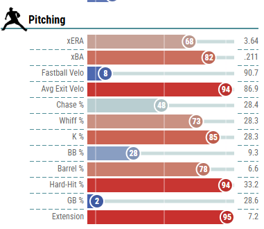 One guy I probably should’ve targeted more as a floor guy in drafts is Ray. He ripped off 5 innings of perfect baseball with 8 K’s on Sunday. Robbie almost exclusively threw his fastball (62.5%). The underlying numbers weren’t great: a total of 8 whiffs in 64 pitches and almost a 40% Ball%. What is so appealing about Ray is the ballpark he plays in and his past success.